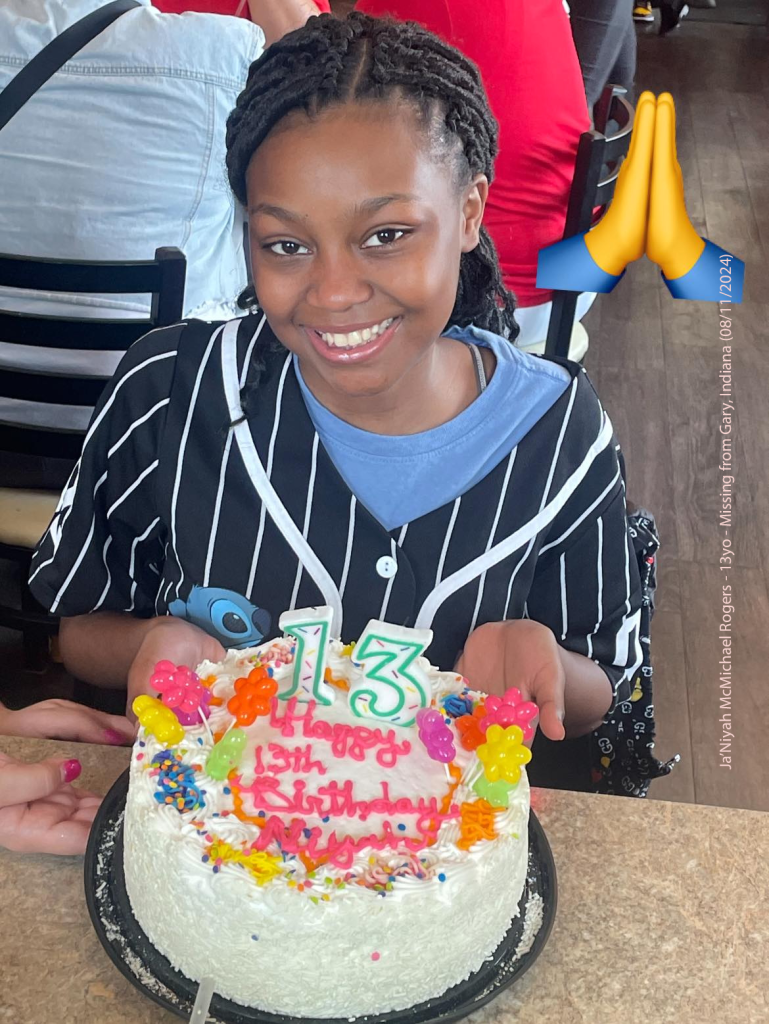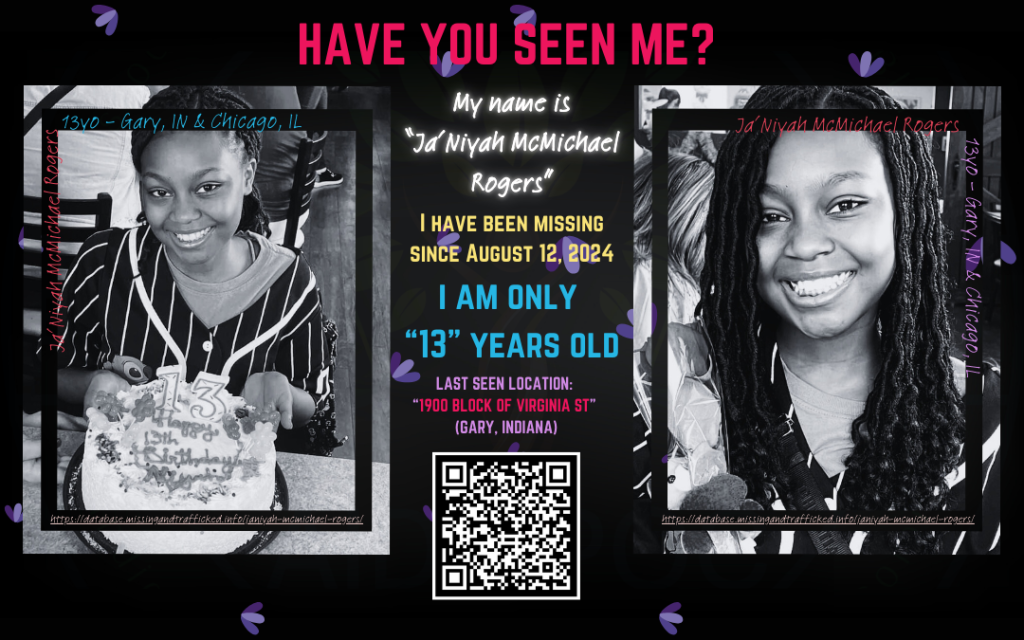 Ja’Niyah McMichael Rogers, a 13-year-old girl from Gary, Indiana, was last seen on August 11, 2024, at her residence in the 1900 block of Virginia Street—now renamed Malcolm X Drive. She was wearing black pajamas, a black hooded sweatshirt, and black and red shoes at the time of her disappearance (USPA Security, 2024).