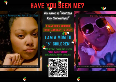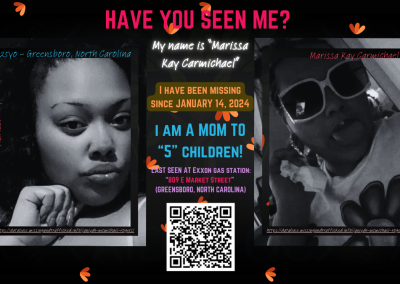 Marissa Kay Carmichael, 25, went missing after traveling to Greensboro, NC on 1/13/24. At 3:40 AM (1/14), she called 911 from Exxon (809 E Market St), saying she’d been left without her phone. Around 5:30 AM, video showed her entering a car; last reported drop-off: Cumberland Apartments.